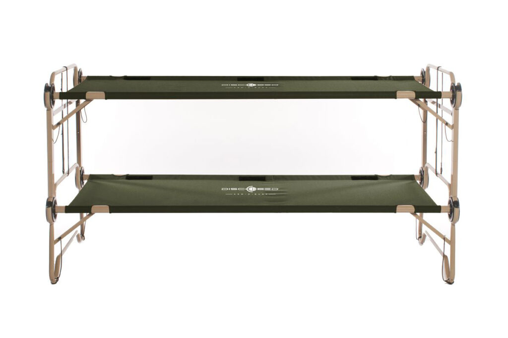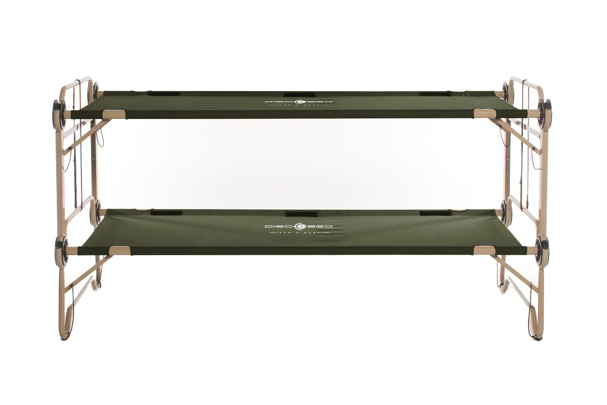 Military field bunk bed Disc-O-Bed Arm-O-Bunk with side organizer in olive military color.
